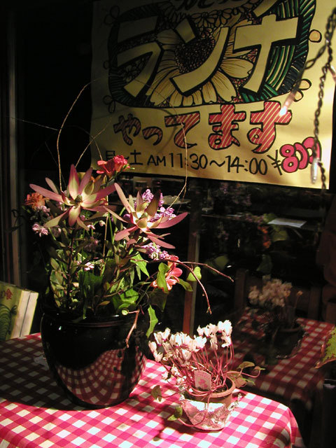 店先のテーブルの黒い壺は正月以来使用しているもの。