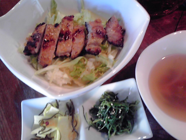 豚肉の味噌漬け丼を作りました。小鉢二種とあったかいスープで疲れをとって健康な新年を迎えましょう。
